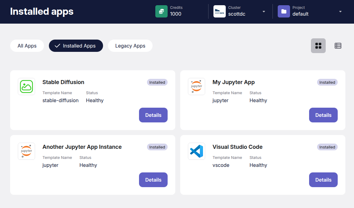 You will see a list of all running apps, including the Jupyter app you just installed. To open the detailed information & uninstall the app, click the Details button.