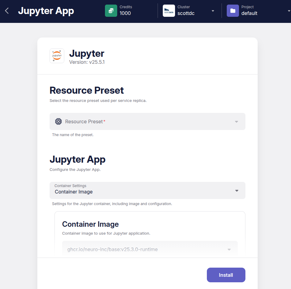Step 1 — Navigate to the Apps page, find Jupyter from the list and click the corresponding "Install" button. This will redirect you to the installation page