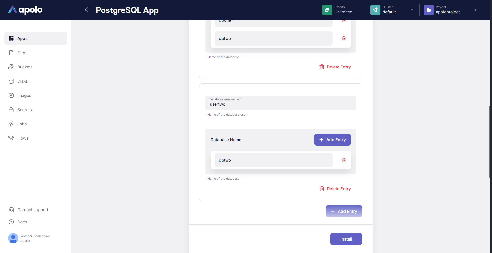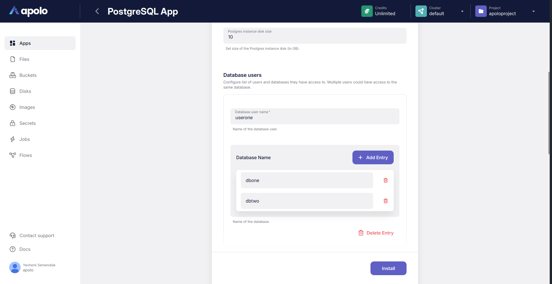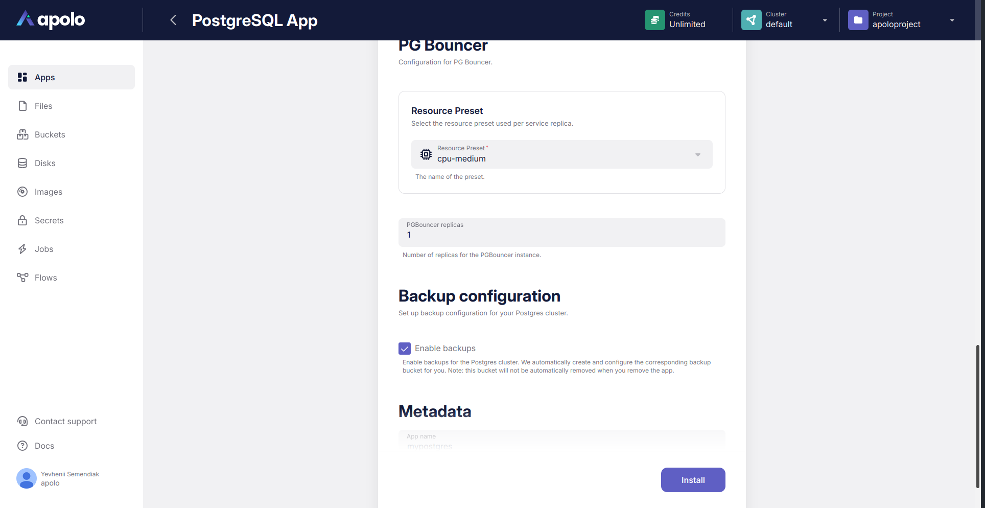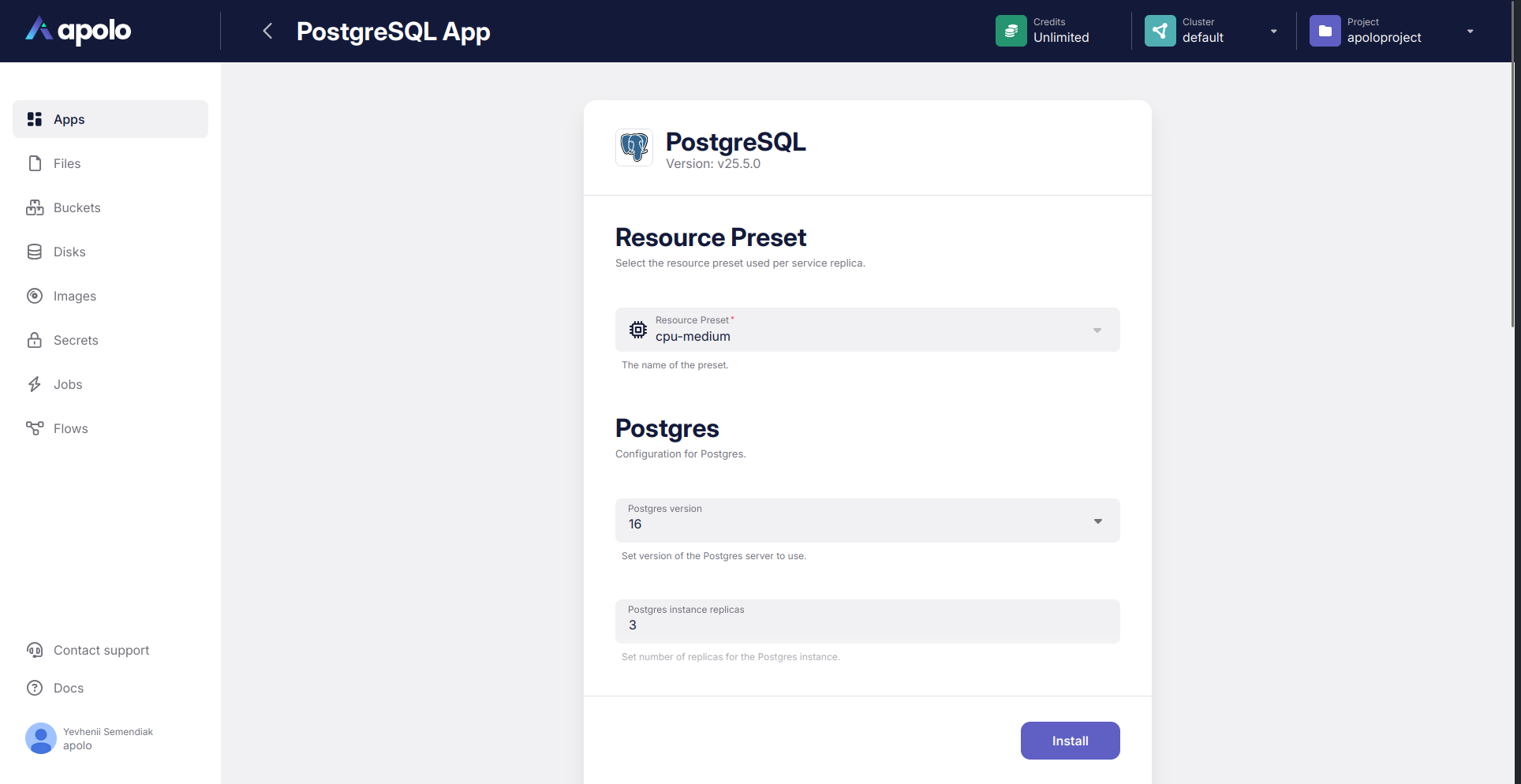 Below is a brief description of how to deploy the PostgreSQL application with exactly the same configuration via Apolo web console.