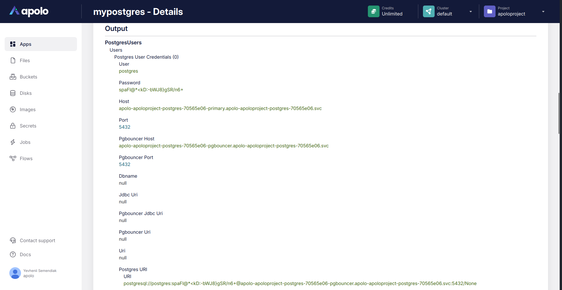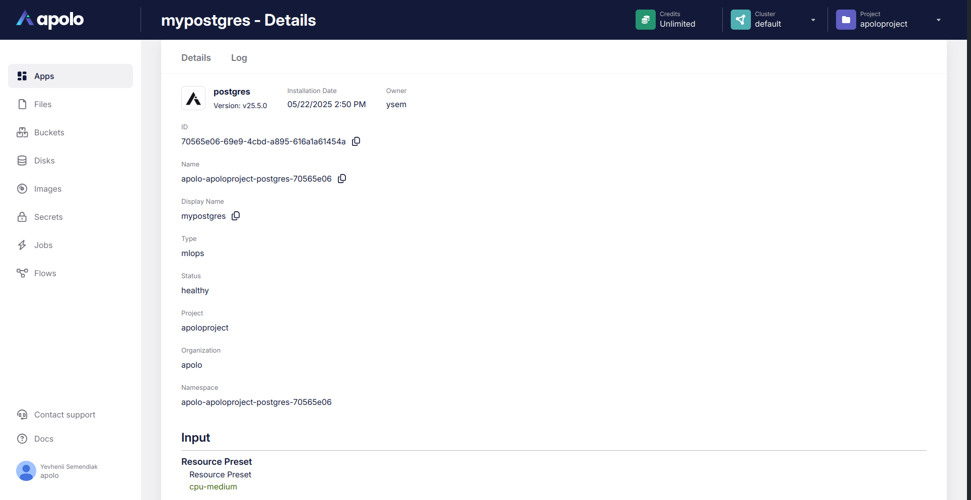As with other applications on Apolo, you can deploy Crunchy PostgreSQL cluster via web console, or using Apolo CLI.