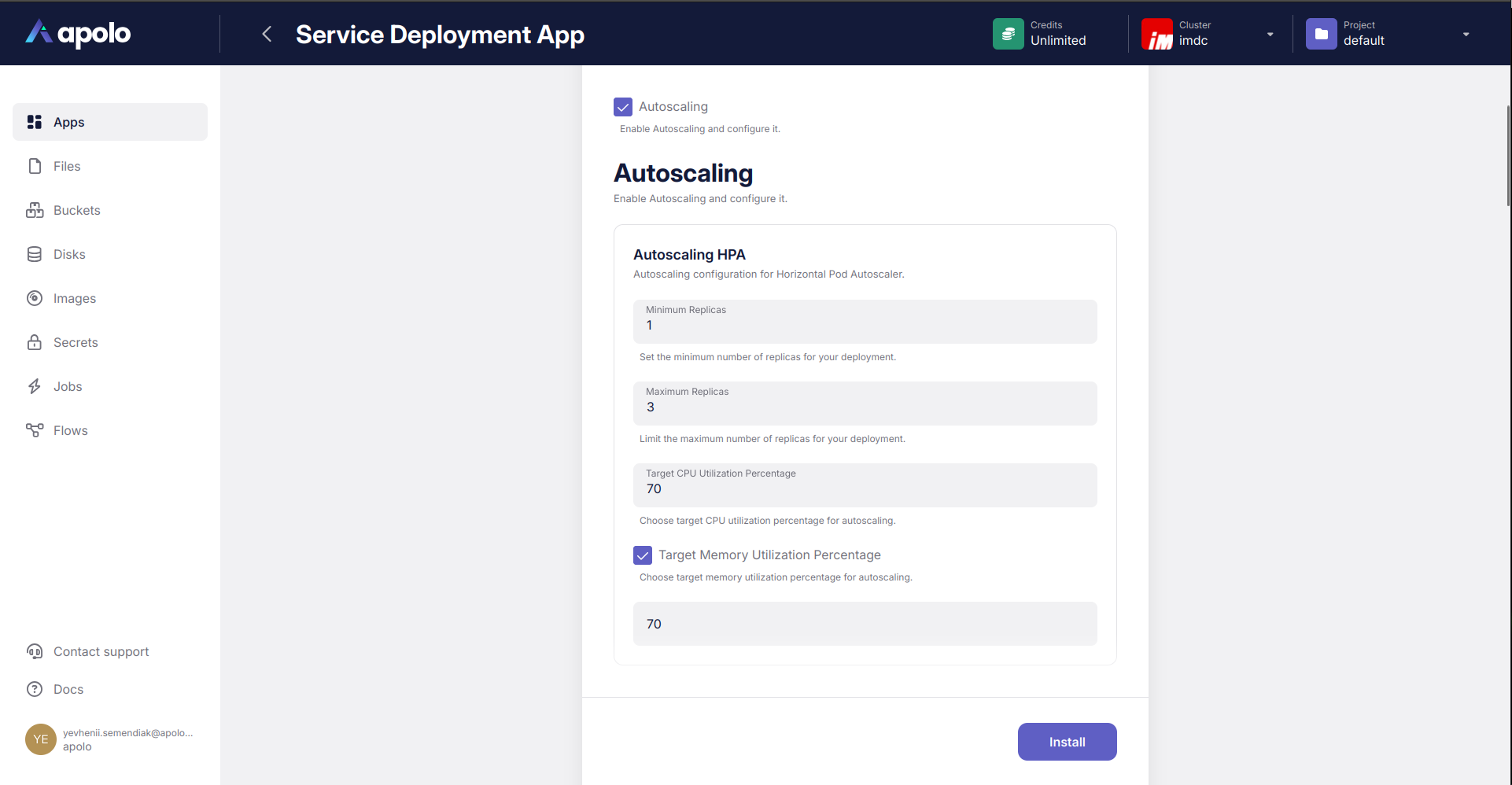 **Autoscaling:** Enable and configure HPA settings, including minimum and maximum replicas, and target CPU and memory utilization percentages.