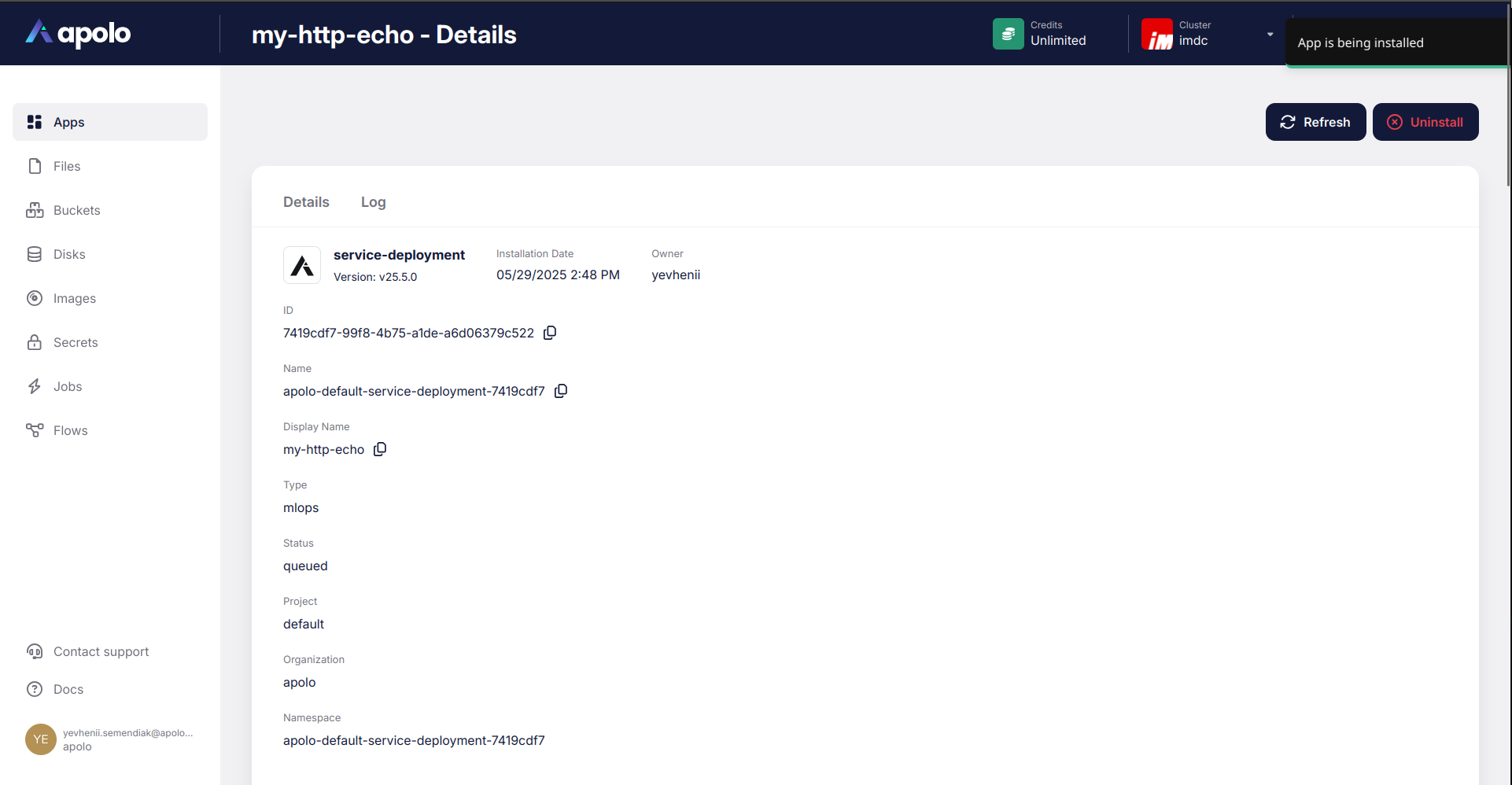 After clicking the "install" button, you will be redirected to the application details page and Apolo will take care of application installation.