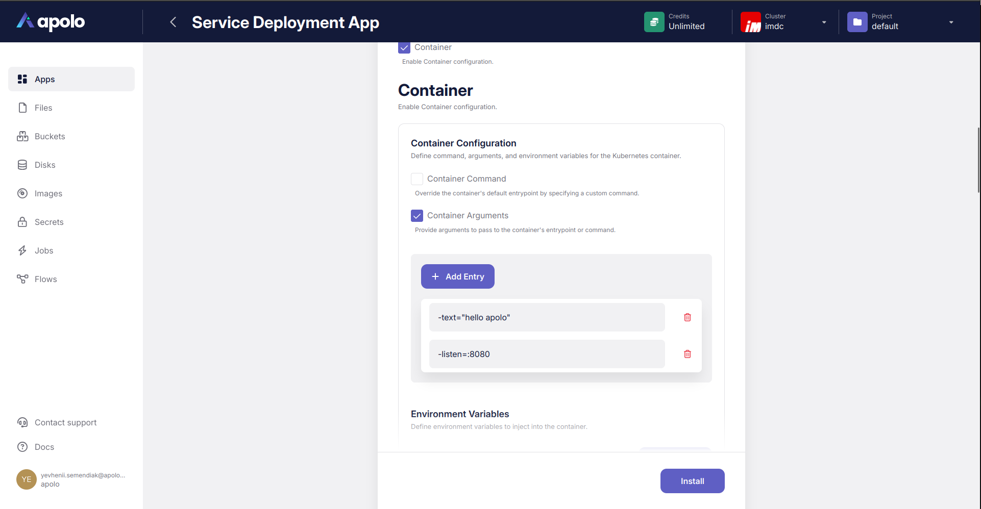 In our case, we add two arguments for the server, `-text="hello apolo"` and `-listen=:8080` so it serves static text for HTTP request on the port 8080. As for the environment variables or storage mounts, we do not to add anything for now.