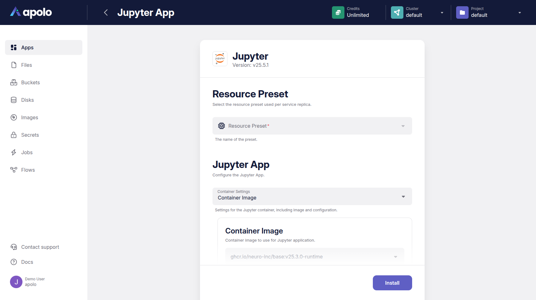 You can install an application directly from the Apolo web console or [using CLI](https://docs.apolo.us/index/apolo-concepts-cli/apps/installable-apps/managing-apps).
